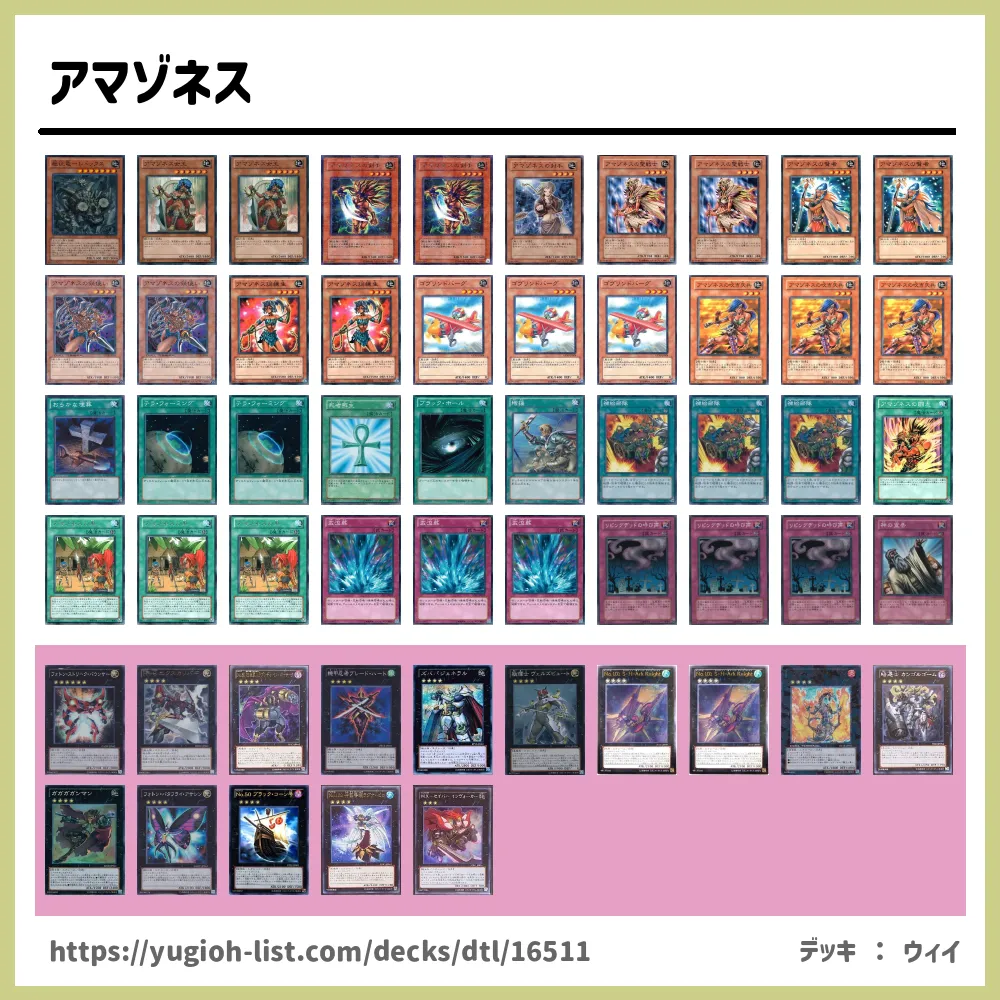 | 《アマゾネスの里》と《補給部隊》で戦力を維持しながら、主にランク4エクシーズに繋ぐ。状況に応じて、各アマゾネスの効果を利用したり、アマゾネスでビートダウンしたりする。《ズババジェネラル》が強い。 | |