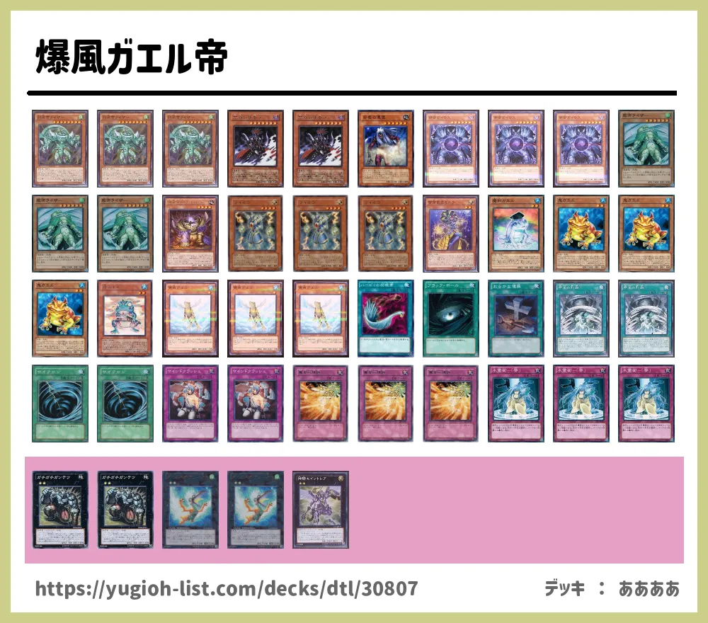 よくあるガエル帝に《烈風帝ライザー》と《鳳翼の爆風》を加えただけ ドローロックとか、好きだからー! 6枚のライザーと3枚の《鳳翼の爆風》を使うとドローロックできる 《鳳翼の爆風》のコストは手札のダブついたカエル達を使っていこう 《ライオウ》はドローロックとは相性の良くないサーチカードを潰してくれるので便利 危険なカードは《水霊術-「葵」》と《マインドクラッシュ》で事前に処理してしまおう 運用方法 1.《黄泉ガエル》を墓地に送る。《鬼ガエル》や《おろかな埋葬》で落とそう。手札にある場合はフィールドに召喚してからの《水霊術-「葵」》や手札から《鳳翼の爆風》を使って落とすとディスアドバンテージが少なくてすむ 2.生き返った《黄泉ガエル》を使い、手札の帝、または使わずに《ライオウ》を出す。この時、2体の生贄が必要な《烈風帝ライザー》を出す場合には、《雷帝家臣ミスラ》や《地帝家臣ランドローブ》、《粋カエル》の特殊召喚効果や、《帝王の烈旋》のリリース肩代わりでがんばる 3.できるだけ毎ターンドローロックをできたらベスト。できなくてもハンデスで相手の戦略の幅を最大限抑えてしまえばベター。そして相手を拘束したところを帝や《ライオウ》で滅多打ちにする 4.勝☆利 |