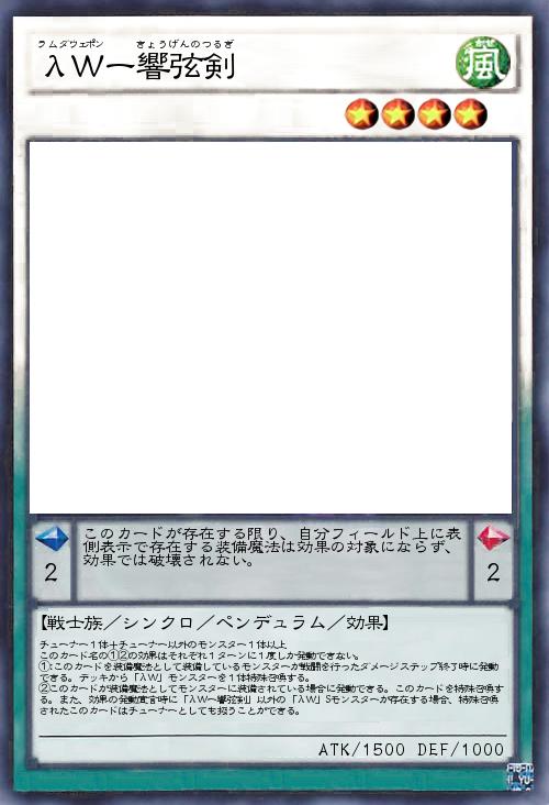 【戦士族/シンクロ/ペンデュラム/効果】 チューナー1体+チューナー以外のモンスター1体以上 このカード名の①②の効果はそれぞれ1ターンに1度しか発動できない。 ①:このカードを装備魔法として装備しているモンスターが戦闘を行ったダメージステップ終了時に発動できる。デッキから「λW」モンスターを1体特殊召喚する。 ②このカードが装備魔法としてモンスターに装備されている場合に発動できる。このカードを特殊召喚する。また、効果の発動宣言時に「λWー響弦剣」以外の「λW」Sモンスターが存在する場合、特殊召喚されたこのカードはチューナーとしても扱うことができる。 このカードが存在する限り、自分フィールド上に表側表示で存在する装備魔法は効果の対象にならず、効果では破壊されない。 |
