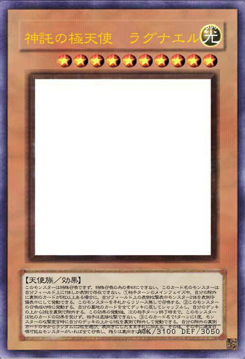 【天使族/効果】 このモンスターは特殊召喚できず、特殊召喚の為の素材にできない。このカード名のモンスターは自分フィールド上に1体しか表側で存在できない。①相手ターンのメインフェイズ中、自分の除外に裏側のカードが5枚以上ある場合に、自分フィールド上の表側攻撃表示モンスター2体を表側守備表示にして発動できる。このモンスターを手札からリリース無しで召喚する。②このモンスターの召喚成功時に発動する。自分の墓地のカードを全てデッキに戻してシャッフルし、自分のデッキの上から2枚を裏側で除外する。この効果の発動後、次の相手ターン終了時まで、このモンスターは他のカードの効果を受けず、相手は直接攻撃できない。③このカード名で1ターンに1度、モンスターの攻撃宣言時に自分のデッキの上から1枚を裏側で除外して発動できる。自分の除外の裏側カードの中からランダムに2枚を選び、表向きにしたまま手札に加える。その後、その中に通常召喚可能なモンスターがいれば全て召喚し、残りは裏向きに戻す。 |