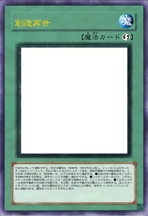 ①2000LP払って発動できる。自分の墓地の「創世神」1体を手札に戻し、フィールド上のモンスター2体をリリースして、手札に戻したそのモンスター1体を、表側守備表示で特殊召喚する。この効果で特殊召喚した「創世神」は、以下の効果を全て適用する。●自身が持つ墓地のモンスターを特殊召喚する効果は、相手ターンにも発動・適用ができる。●このモンスターおよび、このモンスターの効果で特殊召喚したモンスターは効果で破壊されず、リリースできない。●このモンスターは表側守備表示の状態で攻撃でき、その際、自身の守備力を攻撃力として参照する。②このカード名で1ターンに1度、自分の墓地のモンスターが8体以上の場合、相手ターンのエンドフェイズ時に発動できる。墓地のこのカードを手札に戻す。 |
