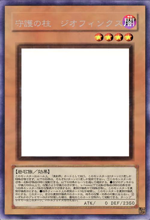 【岩石族/効果】 このモンスターはルール上、「真創界」カードとして扱う。このモンスターは1ターンに1度しか特殊召喚できず、以下の効果は、それぞれ1ターンに1度しか使用できない。①このモンスターの召喚・反転召喚成功時に発動できる。以下の効果から一つを選んで適用する。●自分のデッキから、守備力1000以上で、攻撃力より守備力の方が高く、レベル4以下で反転召喚成功時の効果を持つ効果モンスター1体を攻撃表示で召喚するか、裏側守備表示で特殊召喚し、このモンスターを裏側守備表示にする。●相手フィールド上の表側カード1枚を破壊し、このモンスターを裏側守備表示にする。このターン、自分の裏側守備表示のカードは、相手の攻撃・効果の対象にならない。②いずれかのプレイヤーのLPが回復した場合、墓地のこのカードを除外して発動できる。ターンプレイヤーはこのターン、バトルフェイズを行えない。 |