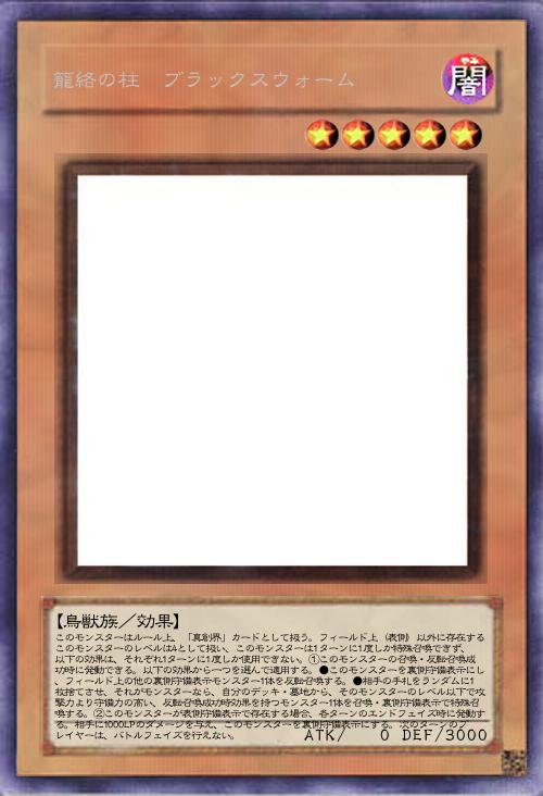 【鳥獣族/効果】 このモンスターはルール上、「真創界」カードとして扱う。フィールド上(表側)以外に存在するこのモンスターのレベルは4として扱い、このモンスターは1ターンに1度しか特殊召喚できず、以下の効果は、それぞれ1ターンに1度しか使用できない。①このモンスターの召喚・反転召喚成功時に発動できる。以下の効果から一つを選んで適用する。●このモンスターを裏側守備表示にし、フィールド上の他の裏側守備表示モンスター1体を反転召喚する。●相手の手札をランダムに1枚捨てさせ、それがモンスターなら、自分のデッキ・墓地から、そのモンスターのレベル以下で攻撃力より守備力の高い、反転召喚成功時効果を持つモンスター1体を召喚・裏側守備表示で特殊召喚する。②このモンスターが表側守備表示で存在する場合、各ターンのエンドフェイズ時に発動する。相手に1000LPのダメージを与え、このモンスターを裏側守備表示にする。次のターンのプレイヤーは、バトルフェイズを行えない。 |