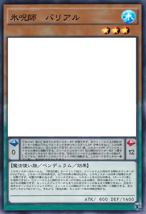 【魔法使い族/ペンデュラム/効果】 このモンスターはルール上、「禁忌刻家」カードとして扱う。フィールド上に存在する解刻カウンターが4つ以下なら、このカードのP効果及び、以下の効果は無効化され、このモンスターは効果で破壊されず、攻撃できず、攻撃の対象にならず、リリースできない。このカード名の②の効果は、1ターンに1度しか使用できない。①フィールド上に解刻カウンターが12個以上ある場合、相手は魔法カードをセットしなければ発動できず、セットしたプレイヤーから見て次の自分ターンが来るまで発動できない。②自分・相手のターンのメインフェイズ中に、フィールド上の解刻カウンターを3つ取り除いて発動できる。自分はデッキから1枚ドローし、手札から「禁忌刻家」モンスター1体を特殊召喚する。 ①自分は1度に2体までしかモンスターをP召喚できず、自分フィールド上の解刻カウンターの数以下のレベル・ランクを持つモンスターしかP召喚できない。この効果は無効化されない。②このカード名で1ターンに1度、このカードがPゾーンにセットされた場合に発動できる。フィールド上のカード1枚に解刻カウンターを3つ置き、自分はデッキから1枚ドローする。③自分フィールド上の解刻カウンターの数が12以下なら、相手ターンのエンドフェイズ時に発動する。このカードをデッキの一番下に戻し、自分は1000LP失う。 |