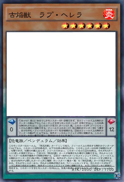 【恐竜族/ペンデュラム/効果】 このモンスターはルール上、「禁忌刻家」カードとして扱う。フィールド上に存在する解刻カウンターが1つ以下なら、このカードのP効果及び、以下の効果は無効化され、このモンスターは効果で破壊されず、攻撃できず、攻撃の対象にならず、リリースできない。このカード名の①②の効果は、それぞれ1ターンに1度しか使用できない。①自分の「禁忌刻家」カードが破壊された場合に発動できる。手札からこのモンスターを表側守備表示で特殊召喚する。②自分・相手のターンのメインフェイズ中に、フィールド上の解刻カウンターを3つ取り除いて発動できる。相手はデッキから1枚ドローし、そのカードを公開する。自分は相手が公開したカードと同じ種類(モンスター・魔法・罠)の「禁忌刻家」カード1枚を手札に加え、それがモンスターなら、手札から特殊召喚するか、Pゾーンにセットする。③このカードがEXデッキに表側で存在する場合、相手ターンのエンドフェイズ時に発動できる。お互いのEXデッキに表側で存在する、このカードを含むモンスターを2枚以上、任意の数選んで持ち主のデッキに戻し、シャッフルする。 ①自分は1度に2体までしかモンスターをP召喚できず、自分フィールド上の解刻カウンターの数以下のレベル・ランクを持つモンスターしかP召喚できない。この効果は無効化されない。②このカード名で1ターンに1度、このカードがPゾーンにセットされた場合に発動できる。フィールド上のカード1枚に解刻カウンターを6つ置き、自分の手札・フィールド上のカード1枚を破壊する。③自分フィールド上の解刻カウンターの数が12以下なら、相手ターンのエンドフェイズ時に発動する。このカードをデッキの一番下に戻し、自分は1000LP失う。 |
