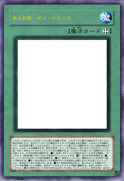 このカード名のカードは1ターンに1度しか発動できず、このカードに置ける解刻カウンターの上限は29個となり、自分フィールド上に解刻カウンターが12個以上ある場合、このカードを発動したり、他の効果で置くことはできない。①このカードに乗っている解刻カウンターの数が6個以下なら、このカードは破壊されず、除外できず、リリースできない。②このカード名で1ターンに1度、自分・相手ターンのメインフェイズ中に発動できる。このカードに乗っている解刻カウンターの数により、以下の効果を適用する。●0:お互いのPゾーンに存在するカードを全て破壊し、デッキから「禁忌刻家」Pモンスター1体をPゾーンにセットする。●3:自分は1500回復する。●6:フィールド上のカード1枚を破壊する。●12:相手フィールド上・墓地のカードを1枚ずつ選んで除外する。●15:自分のEXデッキの表側のカードを3枚以上選んでデッキに戻してシャッフルし、自分はデッキから2枚ドローする。●18:相手は2000LP失う。③このカードに解刻カウンターが24個乗っている場合、相手ターンのエンドフェイズ時に発動する。お互いは手札・フィールド上・墓地・除外のカードを全て持ち主のデッキに戻してシャッフルし、相手は3枚、自分は2枚、デッキからドローする。 |
