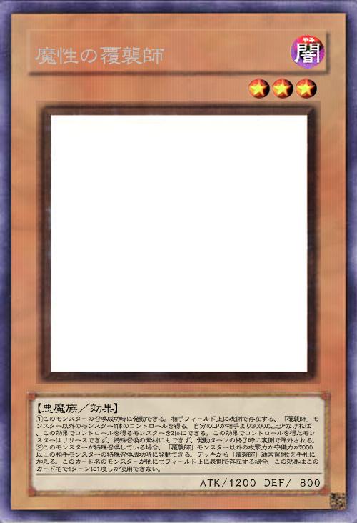 【悪魔族/効果】 ①このモンスターの召喚成功時に発動できる。相手フィールド上に表側で存在する、「覆襲師」モンスター以外のモンスター1体のコントロールを得る。自分のLPが相手より3000以上少なければ、この効果でコントロールを得るモンスターを2体にできる。この効果でコントロールを得たモンスターはリリースできず、特殊召喚の素材にもできず、発動ターンの終了時に裏側で除外される。②このモンスターが特殊召喚している場合、「覆襲師」モンスター以外の攻撃力か守備力が2000以上の相手モンスターの特殊召喚成功時に発動できる。デッキから「覆襲師」通常罠1枚を手札に加える。このカード名のモンスターが他にもフィールド上に表側で存在する場合、この効果はこのカード名で1ターンに1度しか使用できない。 |