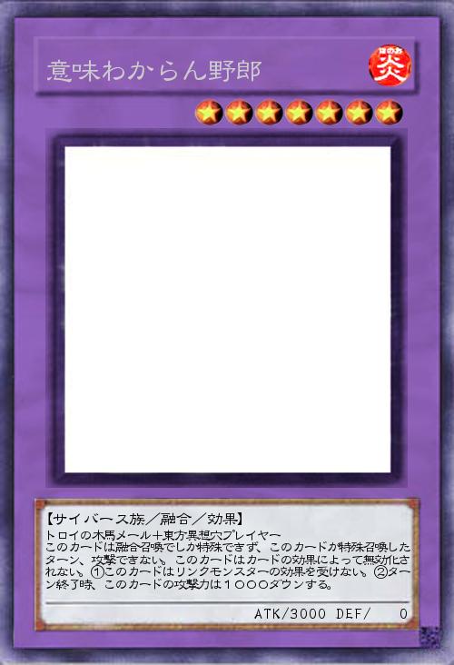 【サイバース族/融合/効果】 トロイの木馬メール+東方異想穴プレイヤー このカードは融合召喚でしか特殊できず、このカードが特殊召喚したターン、攻撃できない。このカードはカードの効果によって無効化されない。①このカードはリンクモンスターの効果を受けない。②ターン終了時、このカードの攻撃力は1000ダウンする。 |