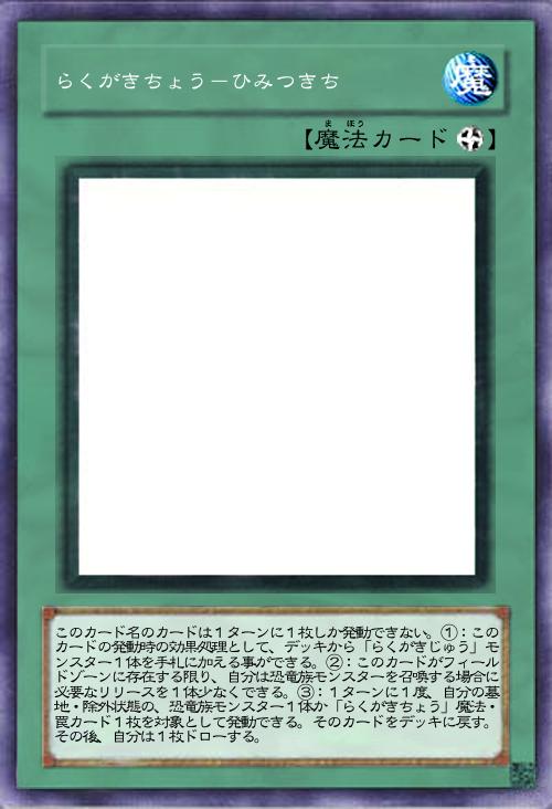 このカード名のカードは1ターンに1枚しか発動できない。①:このカードの発動時の効果処理として、デッキから「らくがきじゅう」モンスター1体を手札に加える事ができる。②:このカードがフィールドゾーンに存在する限り、自分は恐竜族モンスターを召喚する場合に必要なリリースを1体少なくできる。③:1ターンに1度、自分の墓地・除外状態の、恐竜族モンスター1体か「らくがきちょう」魔法・罠カード1枚を対象として発動できる。そのカードをデッキに戻す。その後、自分は1枚ドローする。 |