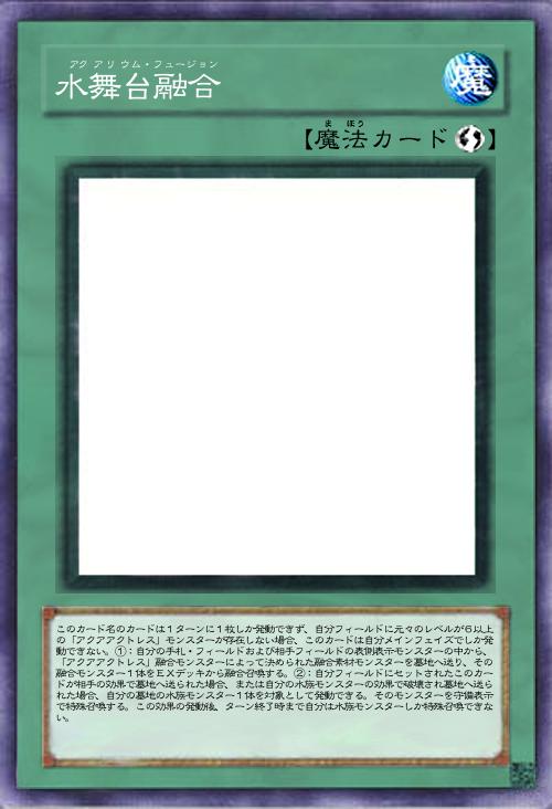 このカード名のカードは1ターンに1枚しか発動できず、自分フィールドに元々のレベルが6以上の「アクアアクトレス」モンスターが存在しない場合、このカードは自分メインフェイズでしか発動できない。①:自分の手札・フィールドおよび相手フィールドの表側表示モンスターの中から、「アクアアクトレス」融合モンスターによって決められた融合素材モンスターを墓地へ送り、その融合モンスター1体をEXデッキから融合召喚する。②:自分フィールドにセットされたこのカードが相手の効果で墓地へ送られた場合、または自分の水族モンスターの効果で破壊され墓地へ送られた場合、自分の墓地の水族モンスター1体を対象として発動できる。そのモンスターを守備表示で特殊召喚する。この効果の発動後、ターン終了時まで自分は水族モンスターしか特殊召喚できない。 |