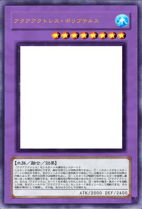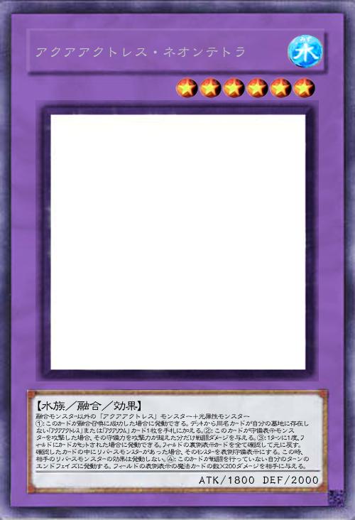 【水族/融合/効果】 「アクアアクトレス」モンスター+水属性モンスター×2 このカードは融合素材にできず、融合召喚でしか特殊召喚できない。①:このカードがモンスターゾーンに存在する限り、自分フィールドの既に表側表示で存在している魔法カードは相手の効果の対象にならず、相手の効果では破壊されない。②:このカードが戦闘で相手モンスターを破壊し墓地へ送った場合に発動できる。自分の墓地及び除外状態の自分のカードの中から「アクアアクトレス」または「アクアリウム」カード1枚を選んで手札に加える。③:相手が魔法・罠カードを発動した時、自分フィールドの「アクアアクトレス」モンスター1体をリリースして発動できる。その発動を無効にして破壊し、その後、自分は800LP回復する。 |