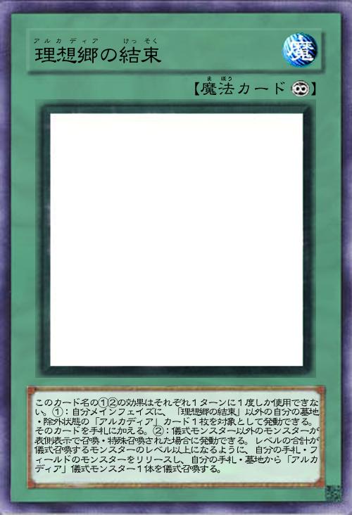 このカード名の①②の効果はそれぞれ1ターンに1度しか使用できない。①:自分メインフェイズに、「理想郷の結束」以外の自分の墓地・除外状態の「アルカディア」カード1枚を対象として発動できる。そのカードを手札に加える。②:儀式モンスター以外のモンスターが表側表示で召喚・特殊召喚された場合に発動できる。レベルの合計が儀式召喚するモンスターのレベル以上になるように、自分の手札・フィールドのモンスターをリリースし、自分の手札・墓地から「アルカディア」儀式モンスター1体を儀式召喚する。 |