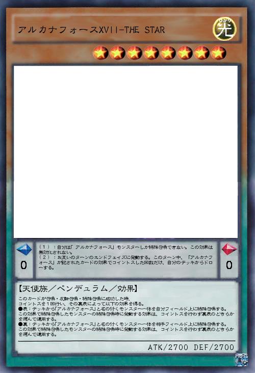 【天使族/効果】 ①:フィールドのモンスター1体を墓地へ送って発動できる。このカードを手札から特殊召喚できる。②:このカードをリリースまたは墓地へ送ってアドバンス召喚・特殊召喚された「アルカナフォース」モンスターの召喚・特殊召喚時に発動する効果は、コイントスを行わず裏表のどちらかを選んで適用できる。③:自分フィールド上の「アルカナフォース」モンスターが魔法カードの効果を受ける場合、墓地のこのカードを除外して発動できる。その効果を無効にして破壊する。 |