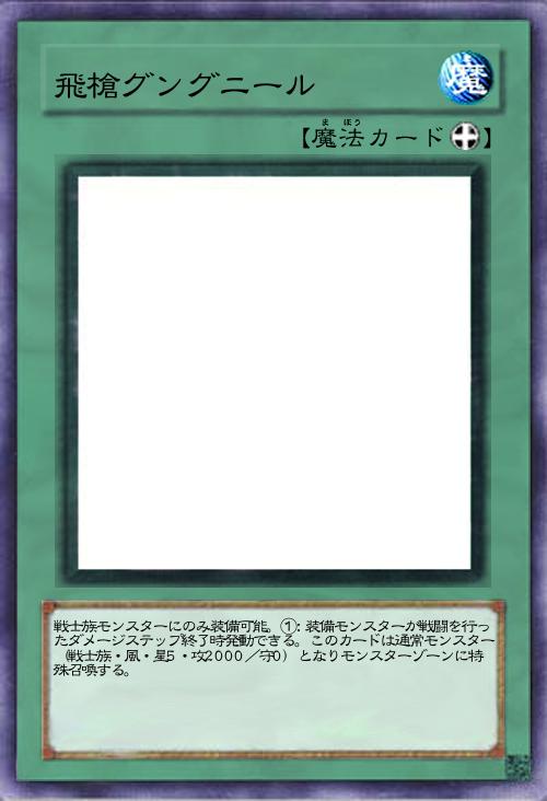 【戦士族/効果】 ①:このカードが召喚した時、発動できる。デッキから「飛槍グングニール」を手札に加える。②:バトルフェイズ中にモンスターが特殊召喚された時、相手フィールドのモンスター1体を対象に取り、発動する。そのモンスターの攻撃力、守備力を0にする。 |