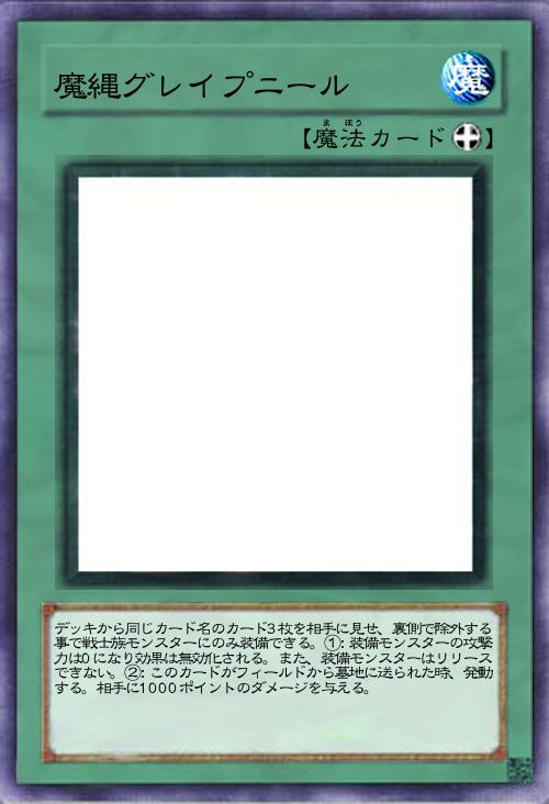 デッキから同じカード名のカード3枚を相手に見せ、裏側で除外する事で戦士族モンスターにのみ装備できる。①:装備モンスターの攻撃力は0になり効果は無効化される。また、装備モンスターはリリースできない。②:このカードがフィールドから墓地に送られた時、発動する。相手に1000ポイントのダメージを与える。 |