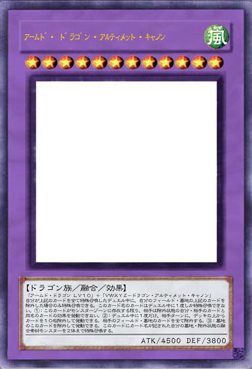 【ドラゴン族/融合/効果】 「アームド・ドラゴン LV10」+「VWXYZ-ドラゴン・アルティメット・キャノン」 自分が上記のカードを全て特殊召喚したデュエル中に、自分のフィールド・墓地の上記のカードを除外した場合のみ特殊召喚できる。このカード名のカードはデュエル中に1度しか特殊召喚できない。①:このカードがモンスターゾーンに存在する限り、相手は除外状態の自分・相手のカードと同名のカードの効果を発動できない。②:デュエル中に1度だけ、相手ターンに、デッキの上からカードを10枚除外して発動できる。相手のフィールド・墓地のカードを全て除外する。③:墓地のこのカードを除外して発動できる。このカードにカード名が記された自分の墓地・除外状態の融合素材モンスターを2体まで特殊召喚する。 |