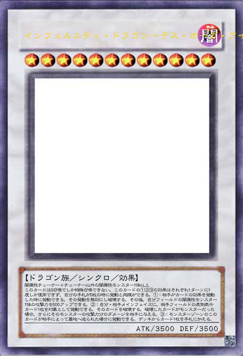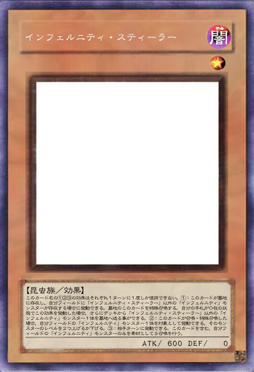 このカードの①③の効果は1ターンに1度、いずれか1つしか使用できない。①:1ターンに1度、自分のLPを半分払って発動できる。自分の手札を全て墓地へ送る。自分フィールドに「インフェルニティ」Sモンスターまたは闇属性ドラゴン族Sモンスターが存在する場合、相手ターンにも発動できる。②:このカードは1ターンに1度だけ効果では破壊されない。③:相手が直接攻撃を宣言した時、自分の手札が0枚の場合、発動できる。そのモンスターの攻撃を無効にし、自分フィールドに「インフェルニティトークン」(悪魔族・闇・星1・攻/守0)2体を特殊召喚する。 |
