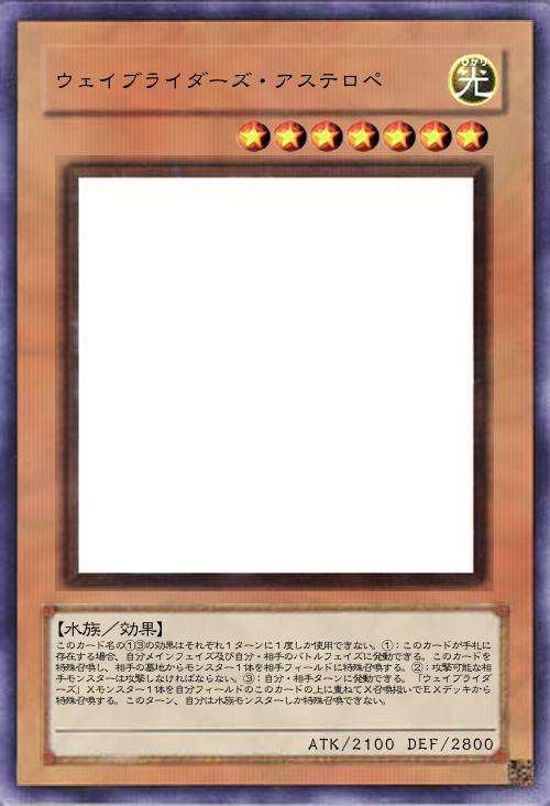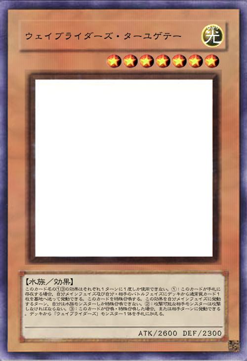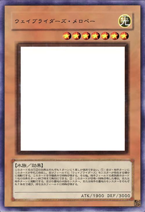 【水族/効果】 このカード名の①③の効果はそれぞれ1ターンに1度しか使用できない。①:自分メインフェイズ及び自分・相手のバトルフェイズに、自分フィールドにモンスターが存在しない場合に発動できる。自分の手札・墓地からこのカードを含む「ウェイブライダーズ」モンスターを2体まで特殊召喚する。②:攻撃可能な相手モンスターは攻撃しなければならない。③:このカードが召喚・特殊召喚した場合、または相手ターンに発動できる。自分のデッキ・墓地から「ウェイブライダーズ」魔法・罠カード1枚を手札に加える。このターン、自分は水族モンスターしか特殊召喚できない。 |