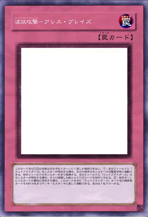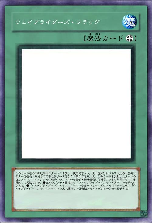 このカード名の①②の効果はそれぞれ1ターンに1度しか使用できない。①:自分か相手のモンスターの攻撃宣言時に発動できる。自分フィールドの「ウェイブライダーズ」モンスターの数×800ダメージを相手に与える。その後、その攻撃を無効にできる。②:自分フィールドに「ウェイブライダーズ」モンスターが存在する場合、墓地のこのカードをデッキの下に戻して発動できる。自分は手札から魔法・罠カード1枚をセットする。この効果でセットしたカードは、自分フィールドに「ウェイブライダーズ」モンスターが存在する限り、セットしたターンでも発動できる。 |