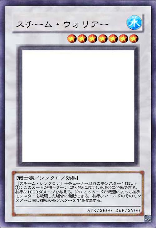 【戦士族/シンクロ/効果】 「スチーム・シンクロン」+チューナー以外のモンスター1体以上 ①:このカードが相手ターンにS召喚に成功した場合に発動できる。相手に1000ダメージを与える。②:このカードが戦闘によって相手モンスターを破壊した場合に発動できる。相手フィールドのそのモンスターと同じ種族のモンスターを1体破壊する。 |