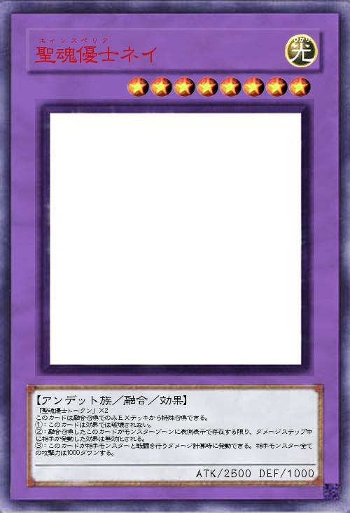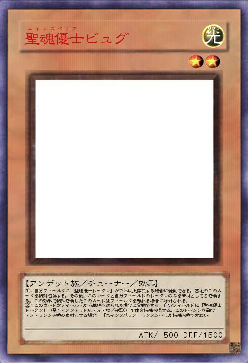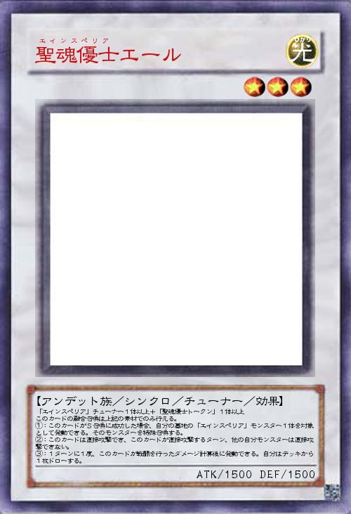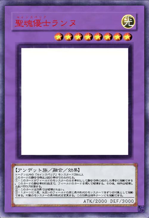 このカードの効果で融合召喚する場合、「エインスペリア」モンスターしか融合素材にできない。 ①:自分フィールドから、融合モンスターカードによって決められた融合素材モンスターを墓地へ送り、その融合モンスター1体をEXデッキから融合召喚する。この効果で融合召喚したモンスターはこのターン相手の効果の対象にならない。 ②:自分フィールドの、「エインスペリア」モンスターのみを素材として融合召喚した融合モンスターが戦闘または相手の効果で破壊された場合、墓地のこのカードを除外して発動できる。自分フィールドに「聖魂優士トークン」1体を特殊召喚する。このトークンを融合・S・リンク召喚の素材とする場合、「エインスペリア」モンスターしか特殊召喚できない。 |