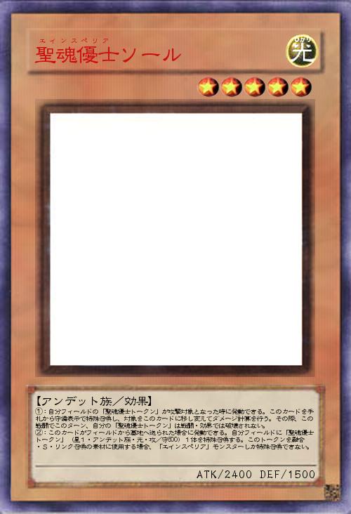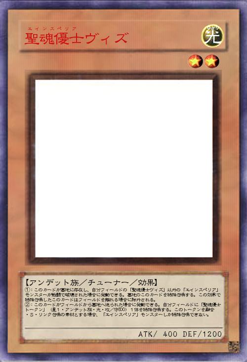 【アンデット族/効果】 ①:このカードが召喚に成功した場合に発動できる。手札からレベル4以下の「エインスペリア」モンスター1体を特殊召喚する。この効果の発動後このターン、自分は光属性モンスターしか特殊召喚できない。 ②:このカードがフィールドから墓地へ送られた場合に発動できる。自分フィールドに「聖魂優士トークン」(星1・アンデット・光・攻/守500)1体を特殊召喚する。このトークンを融合・S・リンク召喚の素材とする場合、「エインスペリア」モンスターしか特殊召喚できない。 |