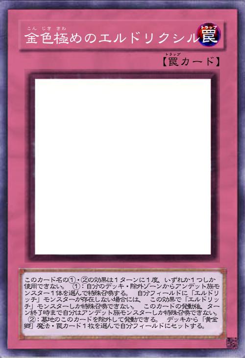 このカード名の①・②の効果は1ターンに1度、いずれか1つしか 使用できない。 ①:自分の手札・除外ゾーンからアンデット族モンスター1体を選んで特殊召喚する。 自分フィールドに「エルドリッチ」モンスターが存在しない場合には、 この効果で「エルドリッチ」モンスターしか特殊召喚できない。 このカードの発動後、ターン終了時まで自分はアンデット族モンスターしか特殊召喚できない。 ②:墓地のこのカードを除外して発動できる。 デッキから「黄金郷」魔法・罠カード1枚を選んで自分フィールドにセットする。 |