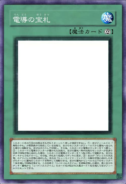 このカード名の①③の効果はそれぞれ1ターンに1度しか使用できない。①:自分フィールドに「無限の手札」が表側表示で存在している状態で、自分のモンスターがフィールドから墓地へ送られた場合に発動する。自分は800LP回復し、その後、このカードに電導カウンターを1つ置く。②:このカードに電導カウンターが置かれた状態で、自分の墓地・除外状態のモンスターが自身の効果で特殊召喚に成功した場合、このカードの電導カウンターを1つ取り除いて発動する。自分はデッキから2枚ドローし、その後、手札を1枚選んでデッキに戻す。③:自分が「オシリスの天空竜」のアドバンス召喚に成功した、または「ヒューマノイド・ドレイク」の融合召喚に成功した自分のターンに墓地のこのカードを除外して発動できる。自分の墓地からレベル4以下のモンスター1体を選んで特殊召喚する。この効果で「リバイバルスライム」を特殊召喚した場合、更に自分のデッキ・墓地から「リバイバルスライム」のカード名が記された罠カード1枚を選んで自分フィールドにセットできる。 |
