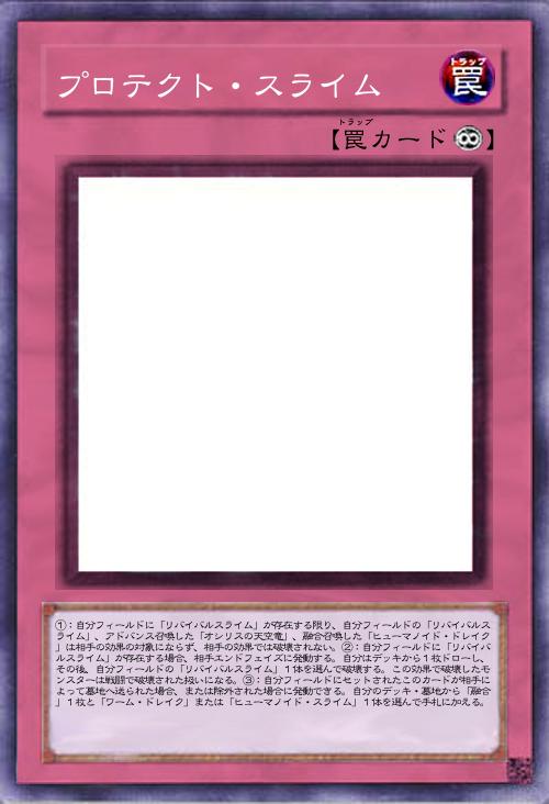 ①:自分フィールドに「リバイバルスライム」が存在する限り、自分フィールドの「リバイバルスライム」、アドバンス召喚した「オシリスの天空竜」、融合召喚した「ヒューマノイド・ドレイク」は相手の効果の対象にならず、相手の効果では破壊されない。②:自分フィールドに「リバイバルスライム」が存在する場合、相手エンドフェイズに発動する。自分はデッキから1枚ドローし、その後、自分フィールドの「リバイバルスライム」1体を選んで破壊する。この効果で破壊したモンスターは戦闘で破壊された扱いになる。③:自分フィールドにセットされたこのカードが相手によって墓地へ送られた場合、または除外された場合に発動できる。自分のデッキ・墓地から「融合」1枚と「ワーム・ドレイク」または「ヒューマノイド・スライム」1体を選んで手札に加える。 |
