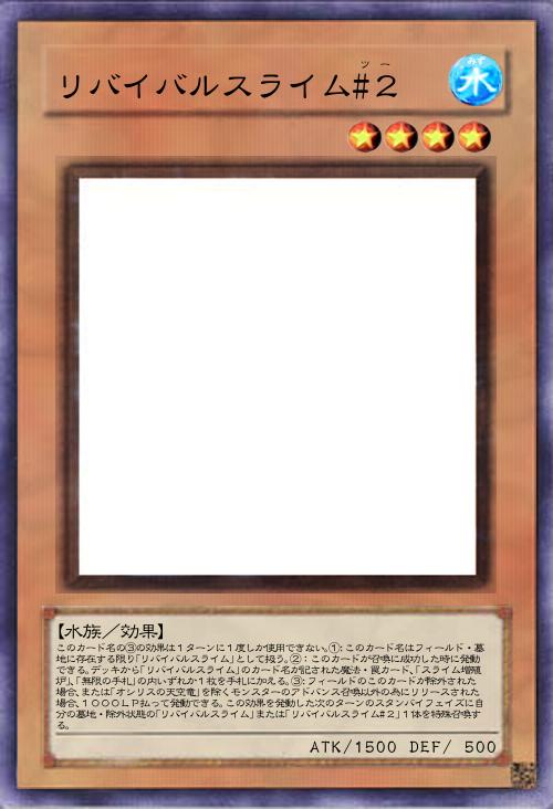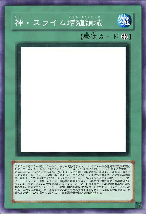 このカード名のカードは1ターンに1枚しか発動できない。①:このカードの発動時の効果処理として、デッキから「リバイバルスライム」、「リバイバルスライム#2」、「オシリスの天空竜」の内いずれか1体を手札に加える。②:1ターンに1度、発動できる。自分フィールドに「スライムモンスタートークン」(水族・水・星1・攻/守500)1体を特殊召喚する。この効果の適用後、次のターン終了時まで自分は「リバイバルスライム」「リバイバルスライム#2」「ヒューマノイド・ドレイク」「神・スライム」のいずれかのモンスターしか特殊召喚できず、神属性以外のモンスターをアドバンス召喚できない。③:フィールドゾーンのこのカードが破壊され墓地へ送られた場合、自分の手札・フィールド・墓地・除外状態の自分のカードの中から、「リバイバルスライム」と元々の属性が「神」となるモンスターをそれぞれ1体ずつデッキに戻して発動できる。自分のEXデッキから「神・スライム」1体を融合召喚扱いで特殊召喚する。 |
