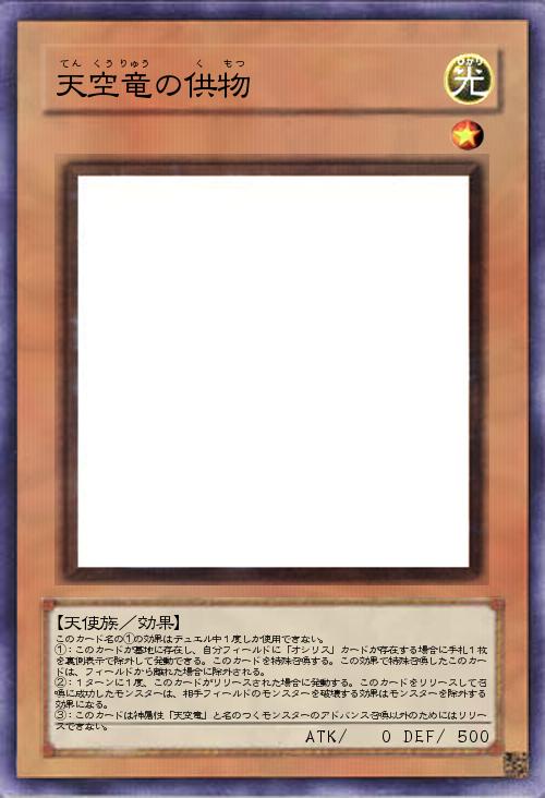 【天使族/効果】 このカード名の①の効果はデュエル中1度しか使用できない。 ①:このカードが墓地に存在し、自分フィールドに「オシリス」カードが存在する場合に手札1枚を裏側表示で除外して発動できる。このカードを特殊召喚する。この効果で特殊召喚したこのカードは、フィールドから離れた場合に除外される。 ②:1ターンに1度、このカードがリリースされた場合に発動する。このカードをリリースして召喚に成功したモンスターは、相手フィールドのモンスターを破壊する効果はモンスターを除外する効果になる。 ③:このカードは神属性「天空竜」と名のつくモンスターのアドバンス召喚以外のためにはリリースできない。 |