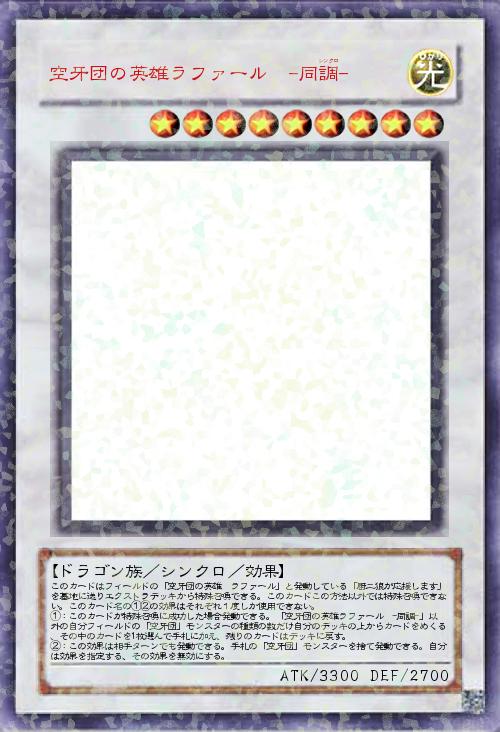 【ドラゴン族/シンクロ/効果】 このカードはフィールドの「空牙団の英雄 ラファール」と発動している「厨二狼が応援します」を墓地に送りエクストラデッキから特殊召喚できる。このカードこの方法以外では特殊召喚できない。このカード名の①②の効果はそれぞれ1度しか使用できない。 ①:このカードが特殊召喚に成功した場合発動できる。「空牙団の英雄ラファール -同調-」以外の自分フィールドの「空牙団」モンスターの種類の数だけ自分のデッキの上からカードをめくる、その中のカードを1枚選んで手札に加え、残りのカードはデッキに戻す。 ②:この効果は相手ターンでも発動できる。手札の「空牙団」モンスターを捨て発動できる。自分は効果を指定する、その効果を無効にする。 |