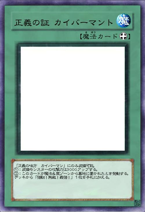 「正義の味方 カイバーマン」にのみ装備可能。 ①:装備モンスターの攻撃力は3000アップする。 ②:このカードが魔法&罠ゾーンから墓地に置かれたとき発動する。デッキから「強靭!無敵!最強!」1枚を手札に加える。 |