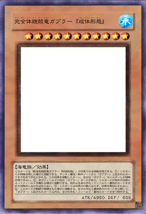 【海竜族/特殊召喚/効果】 このカードは「古代ガプラー『卵膜形態』」の効果でのみ特殊召喚できる。このカード名の「完全体鎧殻竜ガプラー『成体形態』」を特殊召喚する効果は無効にされない。①:このカードが特殊召喚した場合に発動できる。相手は自身のフィールド・手札から合計3枚まで選ぶ。対象のカードを墓地に送る。この効果によって墓地に送られたカードが2枚以下の場合、このカードを墓地に送り、デッキ・手札から「完全体鎧殻竜ガプラー『成体形態』」1体を特殊召喚する。 ②:このカードは効果で破壊されず、1ターンに2度まで戦闘では破壊されない。③:このカードは特殊召喚した次の自分のスタンバイフェイズに、墓地に送り発動する。デッキ・手札から「完全体鎧殻竜ガプラー『成体形態』」1体を特殊召喚する。 |