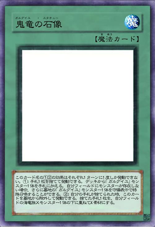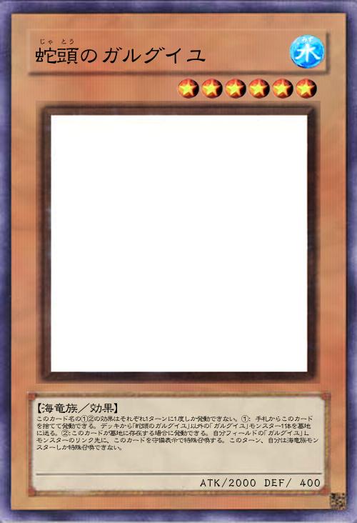 このカード名の①②の効果はそれぞれ1ターンに1度しか発動できない。①:手札1枚を捨てて発動できる。デッキから「ガルグイユ」モンスター1体を手札に加える。自分フィールドにモンスターが存在しない場合、さらに墓地の「ガルグイユ」モンスター1体を守備表示で特殊召喚することができる。②:自分の手札が捨てられた時、このカードを墓地から除外して発動できる。捨てた手札1枚を、自分フィールドの海竜族Xモンスター1体の下に重ねてX素材にする。 |