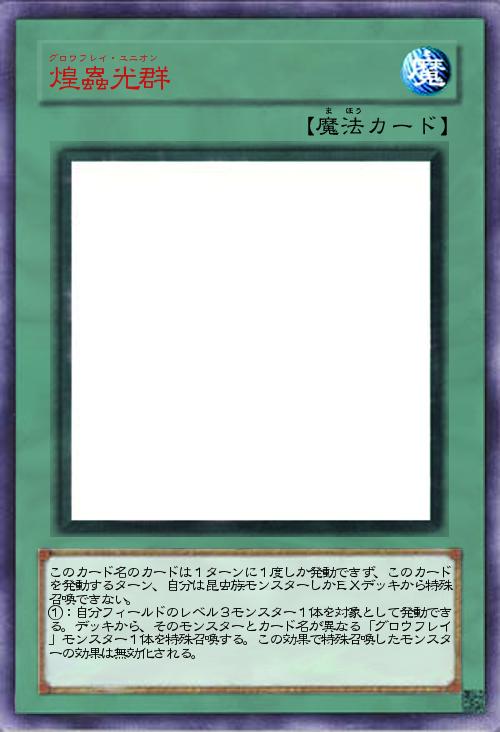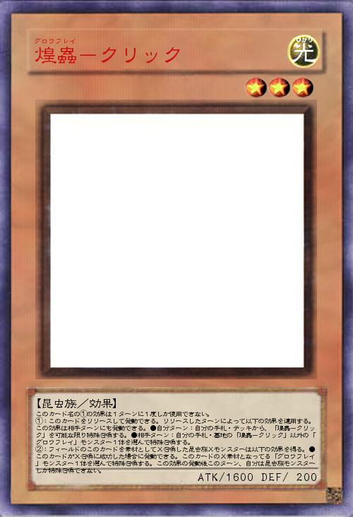 【昆虫族/効果】 このカード名の①の効果は1ターンに1度しか使用できない。 ①:このカードをリリースして発動できる。リリースしたターンによって以下の効果を適用する。この効果は相手ターンにも発動できる。●自分ターン:自分の手札・デッキから、「煌蟲-クリック」を可能な限り特殊召喚する。●相手ターン:自分の手札・墓地の「煌蟲-クリック」以外の「グロウフレイ」モンスター1体を選んで特殊召喚する。 ②:フィールドのこのカードを素材としてX召喚した昆虫族Xモンスターは以下の効果を得る。●このカードがX召喚に成功した場合に発動できる。このカードのX素材となってる「グロウフレイ」モンスター1体を選んで特殊召喚する。この効果の発動後このターン、自分は昆虫族モンスターしか特殊召喚できない。 |