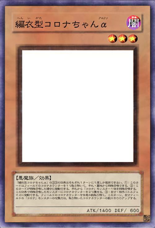 【悪魔族/効果】 「編衣型コロナちゃんα」の②③の効果はそれぞれ1ターンに1度しか使用できない。①:このカードはフィールドのコロナカウンターを1つ取り除いて、手札・墓地から特殊召喚できる。②:このカードが特殊召喚した場合に発動できる。手札から「コロナ」モンスター1体を特殊召喚する。この効果で特殊召喚したモンスターにコロナカウンターを2つ乗せる。③:自分・相手バトルフェイズに発動できる。フィールドのコロナカウンターを任意の数取り除く。このターン、自分フィールドの「コロナ」モンスターの攻撃力は、取り除いたコロナカウンターの数×600アップする。 |