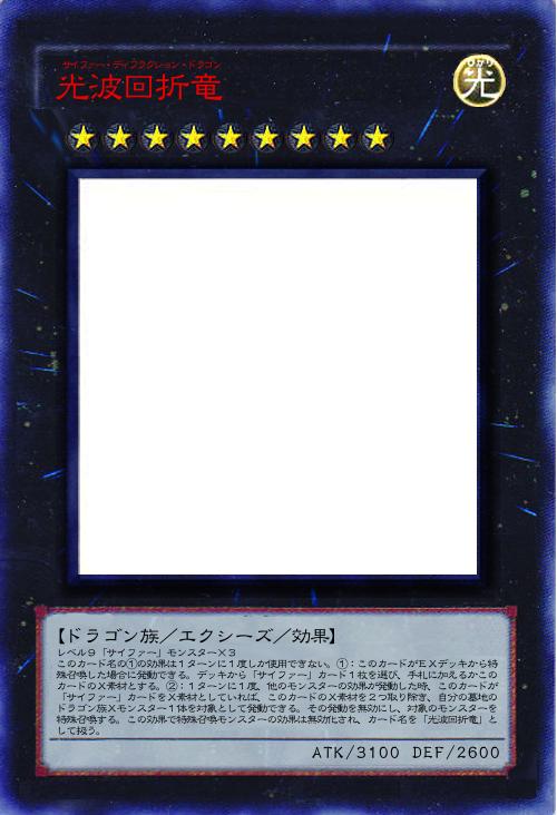 【ドラゴン族/エクシーズ/効果】 「サイファー」レベル8モンスター×2 このカード名の①の効果は1ターンに1度しか使用できない。 ①:自分メインフェイズに発動できる。このカードのコントロールを相手に移し、EXデッキから「銀河眼の光波竜」1体をX召喚扱いで特殊召喚する。その後、このカードのX素材を可能な限りそのモンスターの下に重ねてX素材とする。この効果の発動後、ターン終了時まで自分は「サイファー」モンスターしかEXデッキから特殊召喚できない。 ②:このカードを対象として魔法・罠・モンスターの効果が発動した時に発動する。フィールドの全てのモンスターは攻撃表示になる。この時、リバースモンスターの効果は発動しない。 |