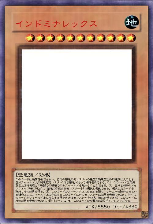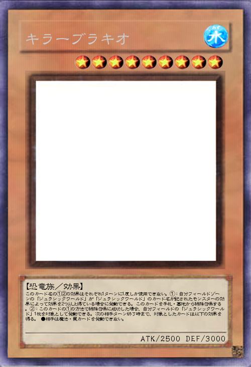 【恐竜族/効果】 このカードは通常召喚できない。自分の墓地のモンスターの種族が恐竜族含め10種類以上のとき自分フィールド上の恐竜族モンスター1体を墓地へ送って特殊召喚できる。①:このカードは恐竜族または海竜族との戦闘での破壊でのみフィールドを離れることができる。②:自分と相手のメインフェイズ時に1度ずつ、墓地に存在するモンスターを1体選択し発動できる。選択したカードを除外しその効果を得る。③:このカードがフィールド上に存在する限り、ゲームから除外されている種族と同じフィールド上に存在するこのカード以外のモンスターは効果を発動できない。④:このカードがフィールド上に存在する限り自分はモンスターを召喚、特殊召喚できず。このカード以外の効果を発動できない。⑤:1ターンに1度、このカードの攻撃力は550ポイントアップする。 |