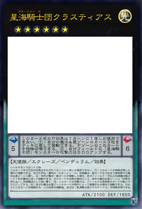 【天使族/エクシーズ/ペンデュラム/効果】 レベル6モンスター×2体 このカード名の①②の効果はそれぞれ1ターンに1度しか使用できない。①:このカードが特殊召喚した場合に発動できる。自分の手札・墓地の「スターフォース」永続魔法・罠カードを3枚まで表側表示で魔法&罠ゾーンに置く。②:相手が魔法・罠カードが発動した場合、自分フィールド・手札の永続魔法罠カード1枚を墓地に送って発動できる。そのカードの効果を無効にして、相手の魔法&罠ゾーンに「効果を持たない」永続魔法として扱い置く。③:このカードの攻撃力は、フィールドの表側表示カードの数×300アップする。④:自分の魔法&罠ゾーンのカードが相手によって2枚以上破壊される場合に発動できる。代わりにこのカードを破壊する。この効果を発動後、自分は「星海騎士団クラスティアス」を特殊召喚できない。 このカード名のP効果は1ターンに1度しか使用できない。①:自分の魔法&罠ゾーンのカード3枚をデッキに戻して発動できる。Pゾーンのこのカードを特殊召喚できる。②:自分フィールドの「星海騎士団」モンスターの攻撃力は500アップする。 |