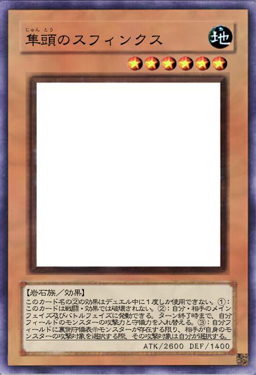 【岩石族/効果】 このカード名の②の効果は1ターンに1度しか使用できない。①:自分フィールド・墓地に岩石族以外のモンスターが存在しない場合、このカードはリリースなしで召喚できる。②:このカードが召喚・特殊召喚した場合、自分フィールドの岩石族モンスター1体を対象として発動できる。デッキから、そのモンスターよりも守備力が低い「スフィンクス」モンスター1体を手札に加える。このターン自分は通常召喚に加えて1度だけ、モンスター1体を通常召喚できる。③:このカードがモンスターゾーンに存在する限り、モンスターが反転召喚する度に、相手の手札をランダムに1枚選んでデッキに戻す。 |