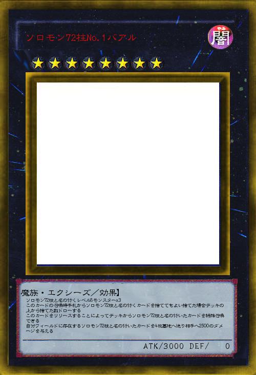 魔族・エクシーズ/効果】 ソロモン72柱と名の付くレベル8モンスターx3〇このカードの召喚時手札からソロモン72柱と名の付くカードを捨ててもよい捨てた場合デッキの上から捨てた数ドローする〇このカードをリリースすることによってデッキからソロモン72柱と名の付いたカードを特殊召喚できる〇自分フィールドに存在するソロモン72柱と名の付いたカードを4枚墓地へ送り相手へ2500のダメージを与える |