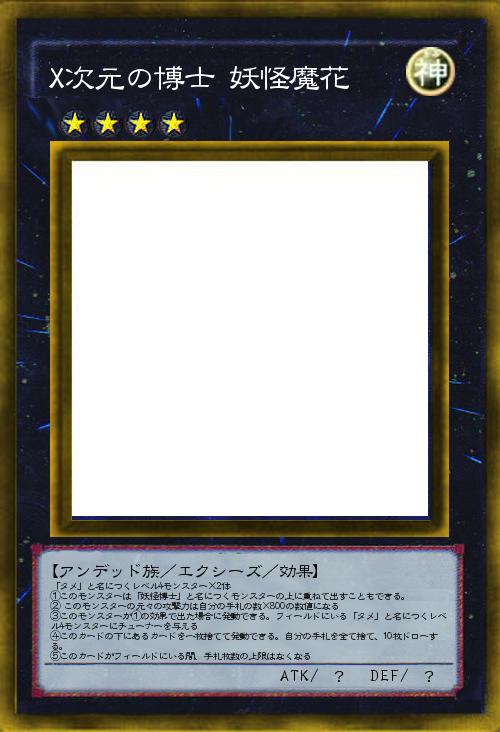 【アンデッド族/エクシーズ/効果】 「タメ」と名につくレベル4モンスター×2体 ①このモンスターは「妖怪博士」と名につくモンスターの上に重ねて出すこともできる。 ② このモンスターの元々の攻撃力は自分の手札の数×800の数値になる ③このモンスターが①の効果で出た場合に発動できる。フィールドにいる「タメ」と名につくレベル4モンスターにチューナーを与える ④このカードの下にあるカードを一枚捨てて発動できる。自分の手札を全て捨て、10枚ドローする。 ⑤このカードがフィールドにいる間、手札枚数の上限はなくなる |