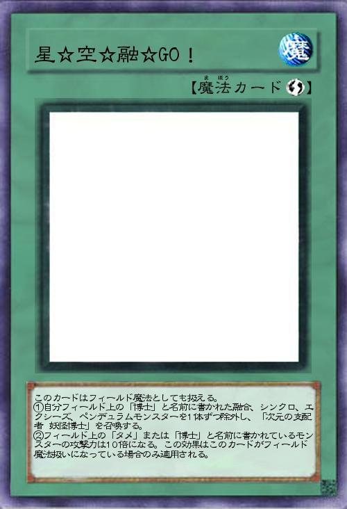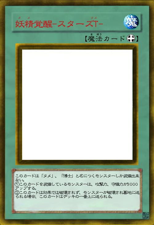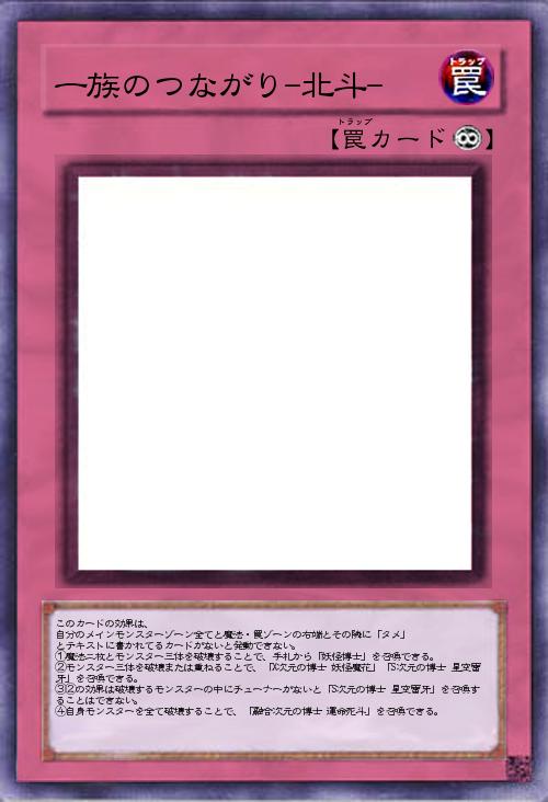 このカードは、フィールドの左端、真ん中、右端魔法・罠ゾーンの右から2番目、4番目に「タメ」「ヤメ」とテキストに書いてあるカードがあれば、③の効果を発動できる ①②の効果は、手札から「ヤメ」を捨てることで発動と処理ができる ①デッキから「タメ」と名につくモンスター3体を右端、左端、真ん中に召喚する ②デッキから「一族のつながり」と名につく魔法・罠カードを右から2番目、4番目の位置に置く。ただしこの効果で出したカードの効果は発動できない ③自分のフィールドのカードを全て破壊し、デッキ、手札、墓地から「妖怪博士」を特殊召喚する。 |