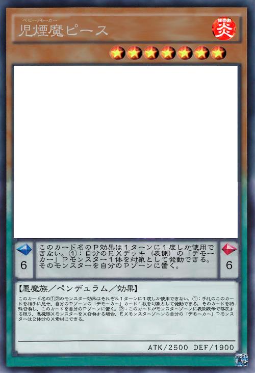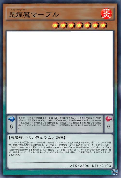 【悪魔族/ペンデュラム/効果】 このカード名の①②のモンスター効果はそれぞれ1ターンに1度しか使用できない。①:このカードが召喚・特殊召喚した場合に発動できる。デッキから「児煙魔マーブル」以外の「デモーカー」Pモンスター1体を自分のPゾーンに置く。このカードがEXモンスターゾーンに特殊召喚されていた場合、Pゾーンに置かず特殊召喚する事もできる。②:自分のPゾーンに「デモーカー」カードが2枚存在する場合、自分・相手ターンに、EXモンスターゾーンのモンスター1体を対象として発動できる。そのモンスターを手札に戻す。 このカード名のP効果は1ターンに1度しか使用できない。①:もう片方の自分のPゾーンに「児煙魔マーブル」以外の「デモーカー」カードが存在する場合、そのカードとこのカードを対象として発動できる。そのカード2枚を効果を無効にして特殊召喚し、そのモンスター2体のみを素材として悪魔族Xモンスター1体のX召喚を行う。 |