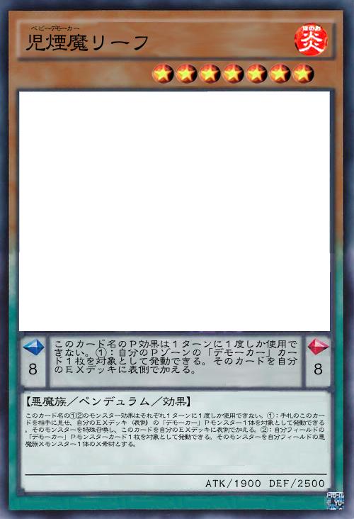 【悪魔族/ペンデュラム/効果】 このカード名の①②のモンスター効果はそれぞれ1ターンに1度しか使用できない。①:このカードが召喚・特殊召喚した場合に発動できる。デッキから「児煙魔ラーク」以外の「デモーカー」Pモンスター1体を自分のEXデッキに表側で加える。このカードがEXモンスターゾーンに特殊召喚されていた場合、EXデッキに加えず特殊召喚する事もできる。②:EXモンスターゾーンに自分の「デモーカー」モンスターが存在する場合、自分・相手ターンに、フィールドの魔法・罠カード1枚を対象として発動できる。そのカードを手札に戻す。 このカード名のP効果は1ターンに1度しか使用できない。①:自分の「デモーカー」XモンスターがX素材を取り除いて効果を発動する場合、取り除くX素材1つの代わりにこのカードを除外できる。 |