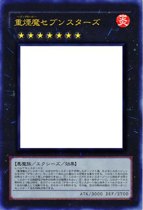 【悪魔族/エクシーズ/効果】 レベル7モンスター×2 「重煙魔セブンスターズ」は自分がモンスターをP召喚したターンに1度、EXモンスターゾーンの自分の「デモーカー」モンスター1体の上に重ねてX召喚する事もできる。このカード名の②の効果は1ターンに1度しか使用できない。①:このカードがEXモンスターゾーンに存在する限り、このカードは戦闘及び相手の効果では破壊されない。②:自分・相手ターンに、このカードのX素材を2つ取り除き、自分フィールドの「デモーカー」モンスター1体と相手フィールドのカード1枚を対象として発動できる。そのカードを除外する。その後、自分の除外状態の「デモーカー」モンスター1体を特殊召喚できる。 |