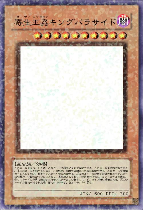 相手のデッキに表側の「寄生虫パラサイド」が存在する場合にのみ、ライフを1000支払って発動出来る。相手は表側の「寄生虫パラサイド」をデッキの1番上に置く。このカードの効果によってデッキの1番上に置かれた「寄生虫パラサイド」を相手がドローした時、そのターン相手が受ける効果ダメージは2倍になる。 |