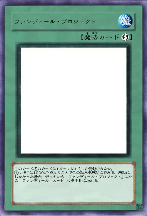 このカード名のカードは1ターンに1枚しか発動できない。 ①:相手は1000LPを払うことでこの効果を無効にできる。無効にしなかった場合、デッキから「ファンディール・プロジェクト」以外の「ファンディール」カード1枚を手札に加える。 |