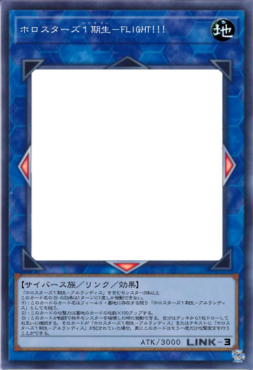 【サイバース族/リンク/効果】 「ホロスターズ1期生-アルランディス」を含むモンスター2体以上 このカード名の(3)の効果は1ターンに1度しか発動できない。 (1):このカードのカード名はフィールド・墓地に存在する限り「ホロスターズ1期生-アルランディス」としても扱う。 (2):このカードの攻撃力は墓地のカードの枚数×100アップする。 (3):このカードが戦闘で相手モンスターを破壊した時に発動できる。自分はデッキから1枚ドローしてお互いに確認する。そのカードが「ホロスターズ1期生-アルランディス」またはテキストに「ホロスターズ1期生-アルランディス」が記されていた場合、更にこのカードはもう一度だけ攻撃宣言を行うことができる。 |